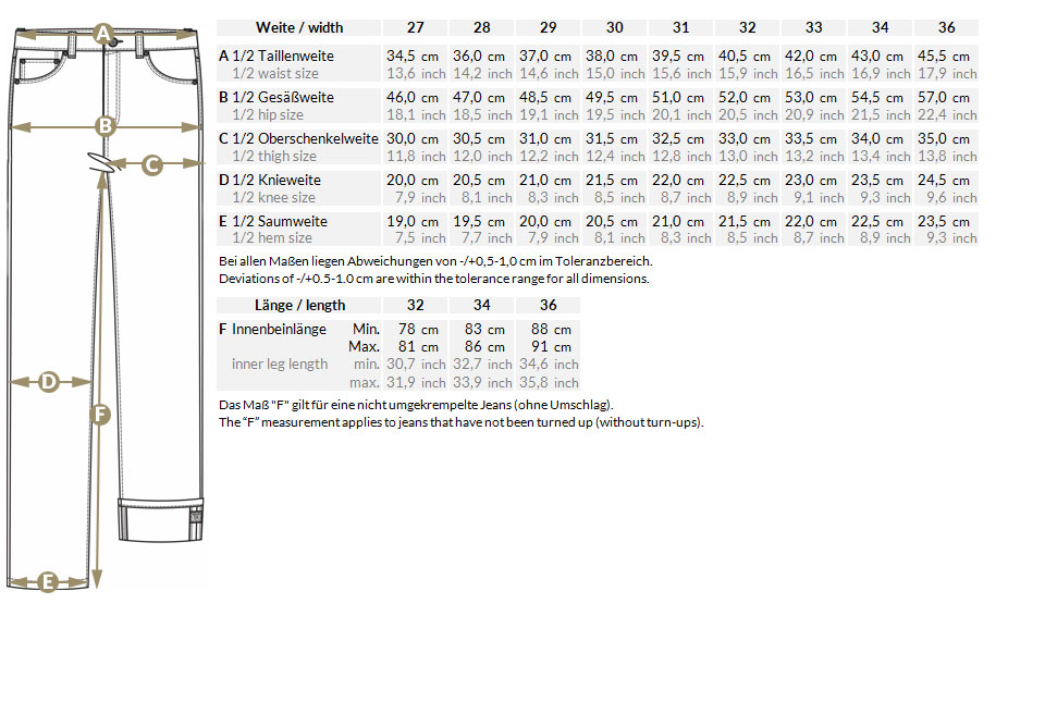 Our model is 171 cm tall, approx. size 42 and wears these trousers in size 33/34.